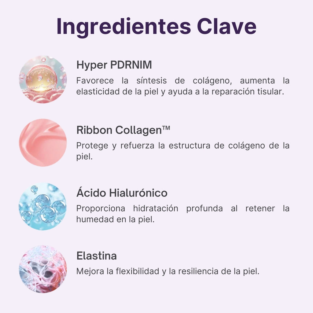 Hyper PDRN™: Promueve la síntesis de colágeno, aumenta la elasticidad y apoya la reparación celular.