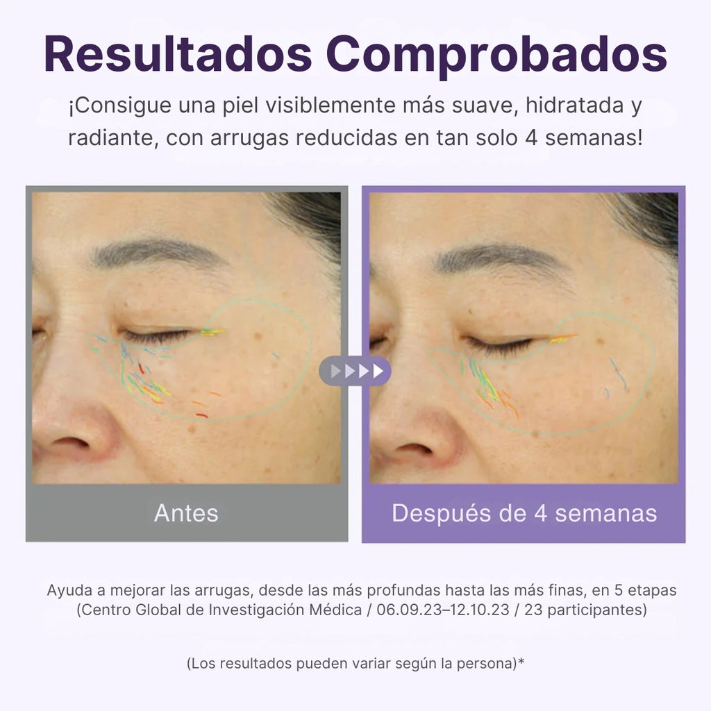 Resultados Probados en 4 Semanas: Logra una piel visiblemente más suave, hidratada, radiante y con menos arrugas en tan solo un mes de uso constante.