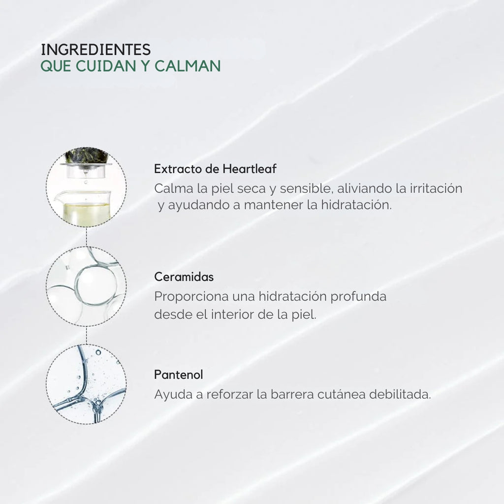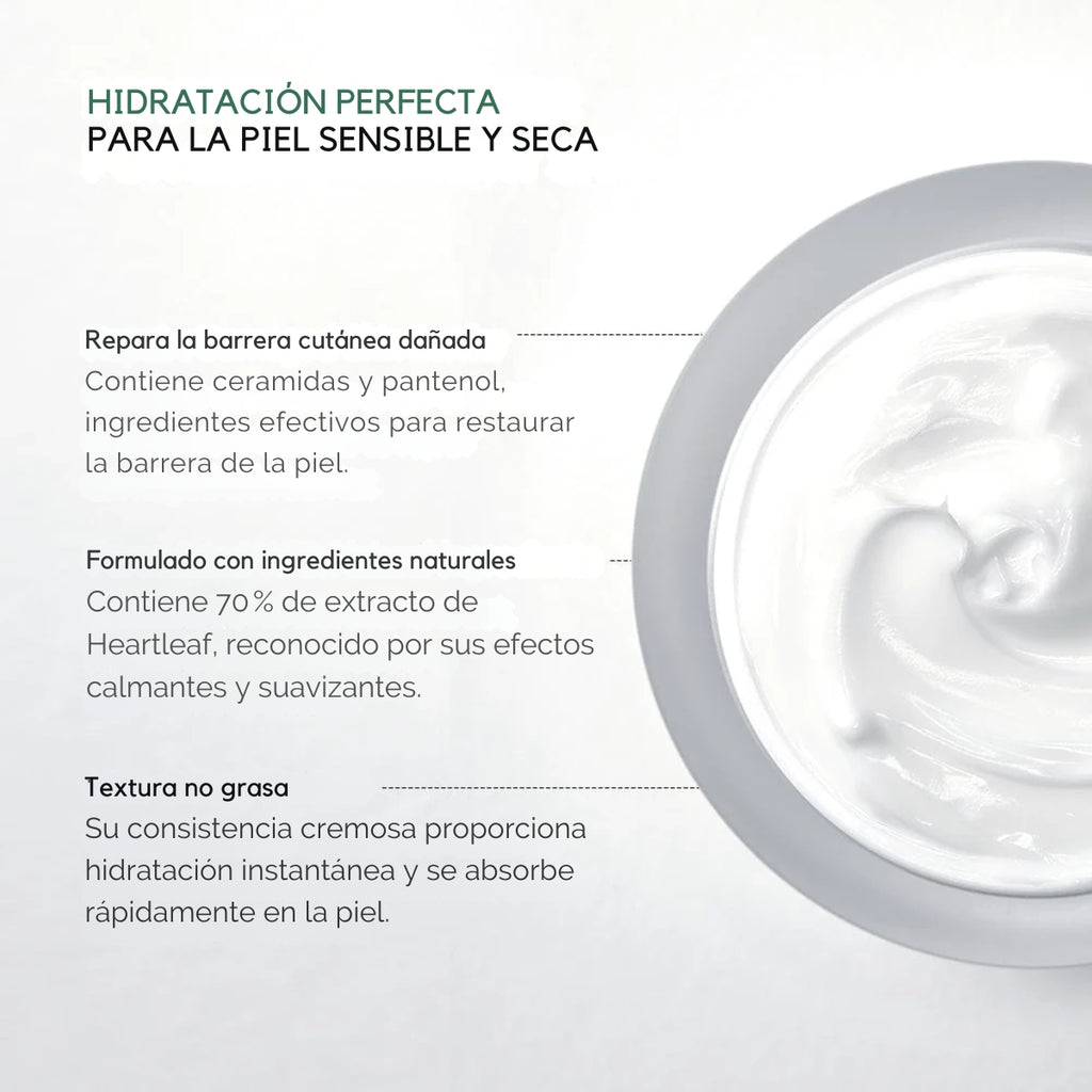 - Crema nutritiva con un 70% de extracto de Heartleaf que calma la piel sensible y ayuda a eliminar impurezas.