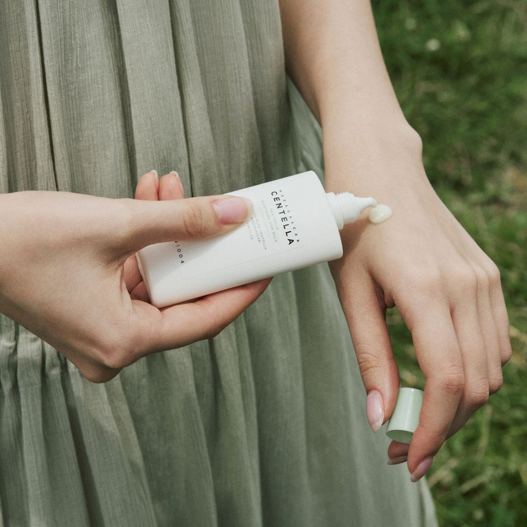 Cómo se usa la protección solar Madagascar Centella Tea-Trica Soothing Sun Milk de SKIN1004